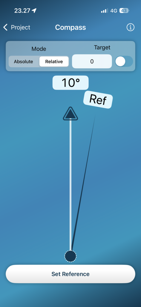 Start by setting the reference point. Point the compass arrow in the reference direction and press the \”Set Reference\” button. Once the reference is set, the compass measures the horizontal angle relative to the reference.
