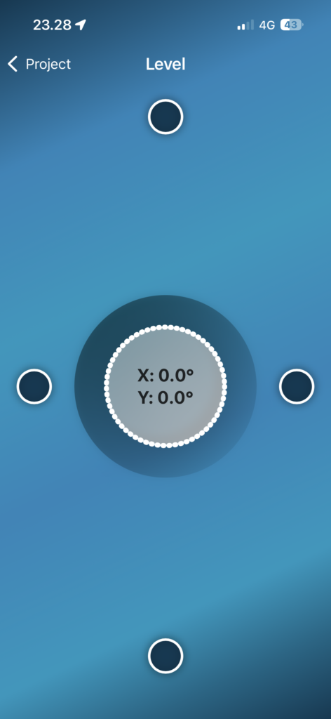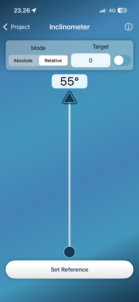 The internal inclinometer of the iOS device can be used to measure vertical angles. When measuring, try to keep the device horizontally straight without tilting for the most accurate results. The blue needle will guide you. You can also take measurements by tilting the device 90° on its side, which may make it easier to read the results on the display.