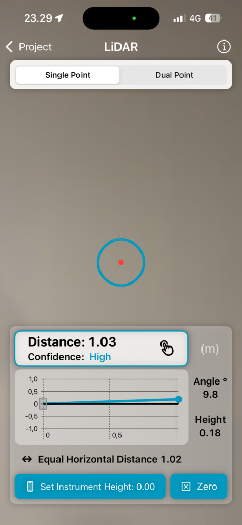 In single point mode, the device works like a laser rangefinder, but you can’t take measurements from very far. The height is measured relative to the device by default, but if you want, you can set the instrument height by pointing the device at the floor and pressing “Set Instrument Height”, after which the height will be measured relative to the floor.