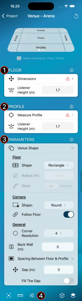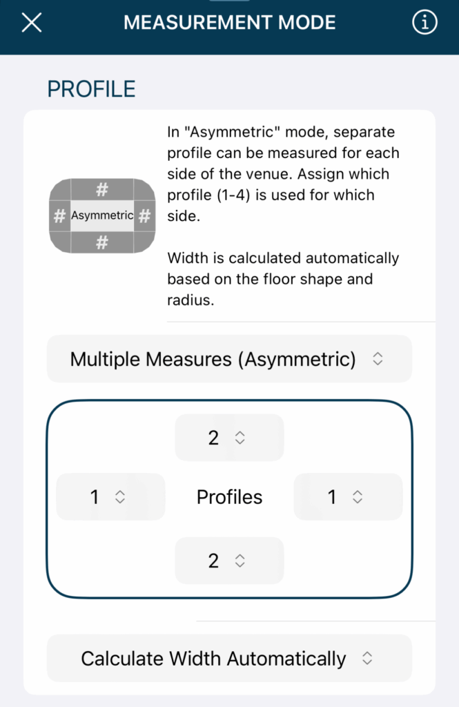At the bottom of the page you can find the measurement mode button. This opens a menu where it is possible to modify the way the venue is measured. By default, the user interface and measurement workflow are kept simple, but here you can take it further.