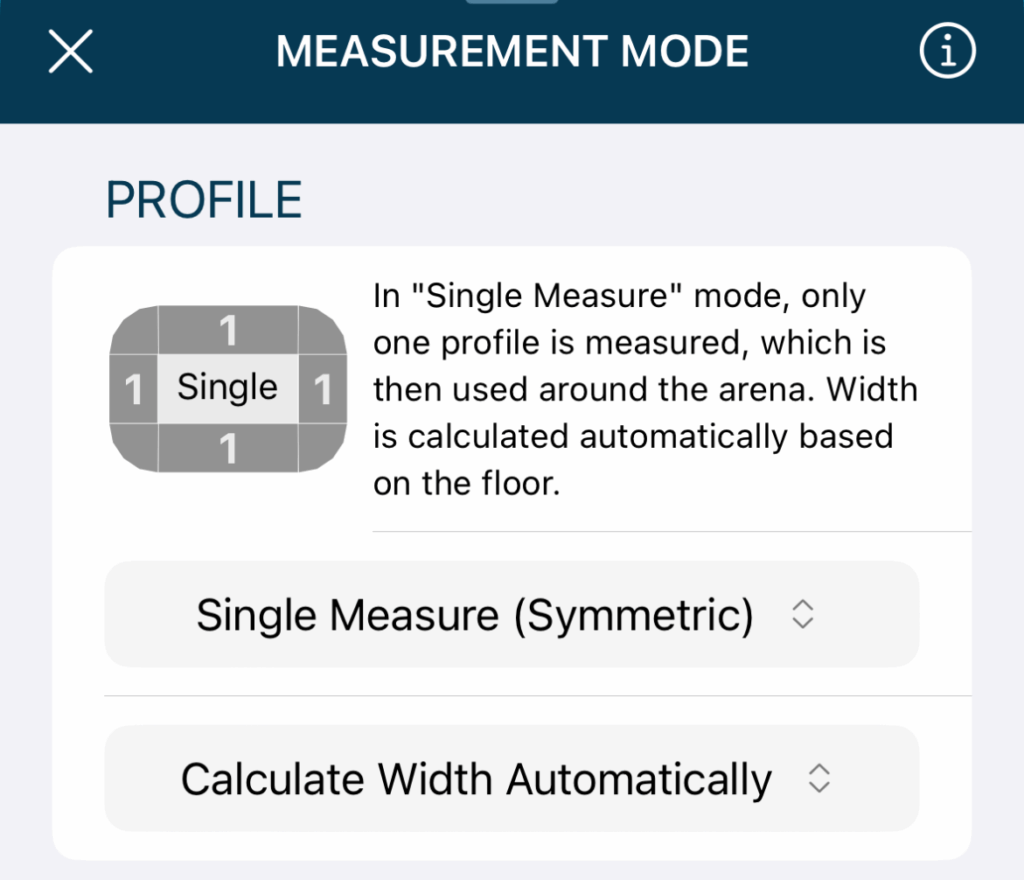 By default, the profile measurement is set to a single mode, which means that the profile of the raked seating is symmetrical so only one profile measurement is taken, which is then used around the arena.